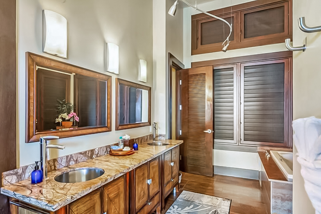 Upstairs, an extended ocean-view lounge invites conversation and sunset viewing with plush leather seating (that pulls out into a bed) and a live-edge wood table. Another cozy area with a 75” TV and nearby lanai offers yet another inviting retreat.