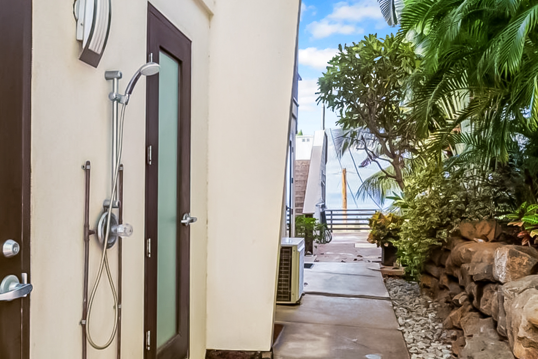 Tucked into the lush landscape, a private outdoor shower adds a touch of island indulgence, while beach essentials are on hand for your days by the sea.
