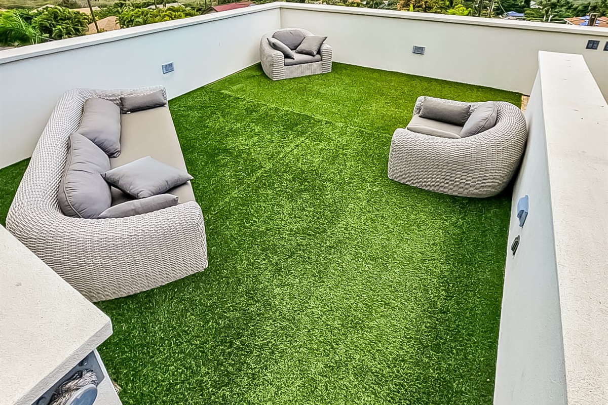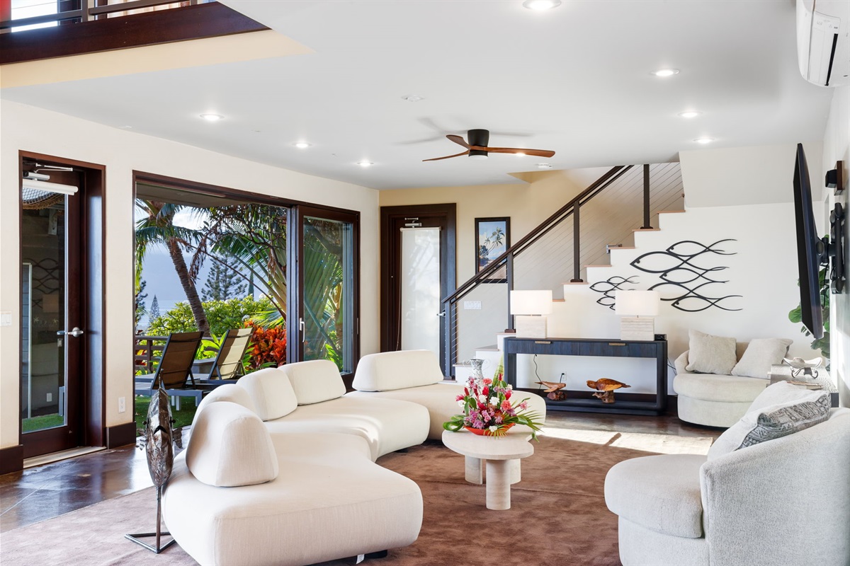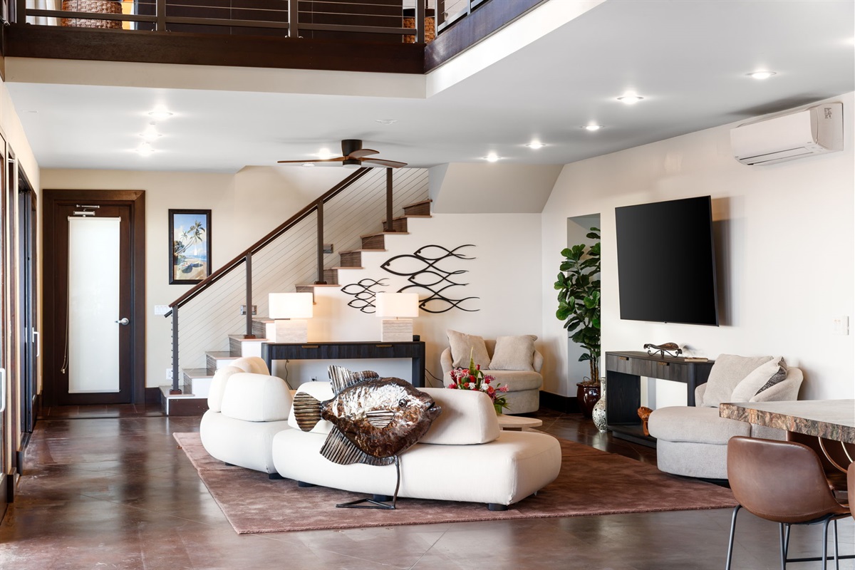 Gather & Unwind The home’s expansive layout flows effortlessly for connection and relaxation. Downstairs, a welcoming lounge features luxury sofas, tropical greenery, original local art, and an 85” Smart TV.