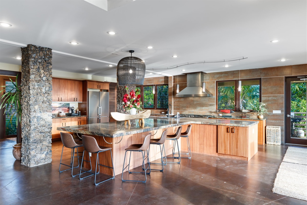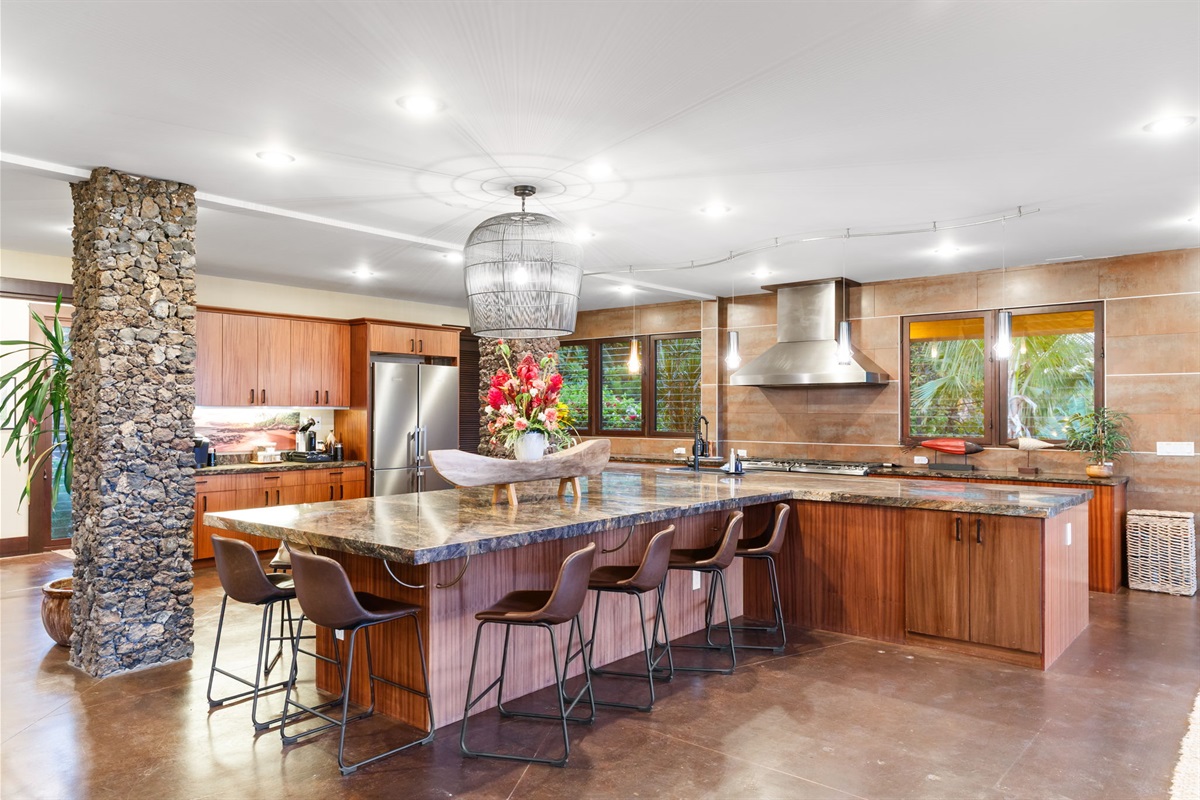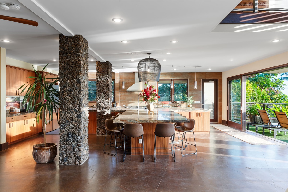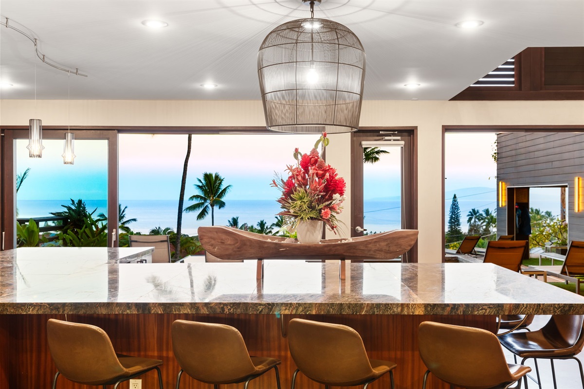 A Chef’s Dream Kitchen Whether you’re crafting meals yourself or enjoying the expertise of a private chef, the gourmet kitchen is a culinary showpiece. Stainless steel appliances, rich lava rock columns, and designer lighting create a modern yet warm atmosphere. Direct ocean views and a massive peninsula bar with seating for ten make the space both functional and social.